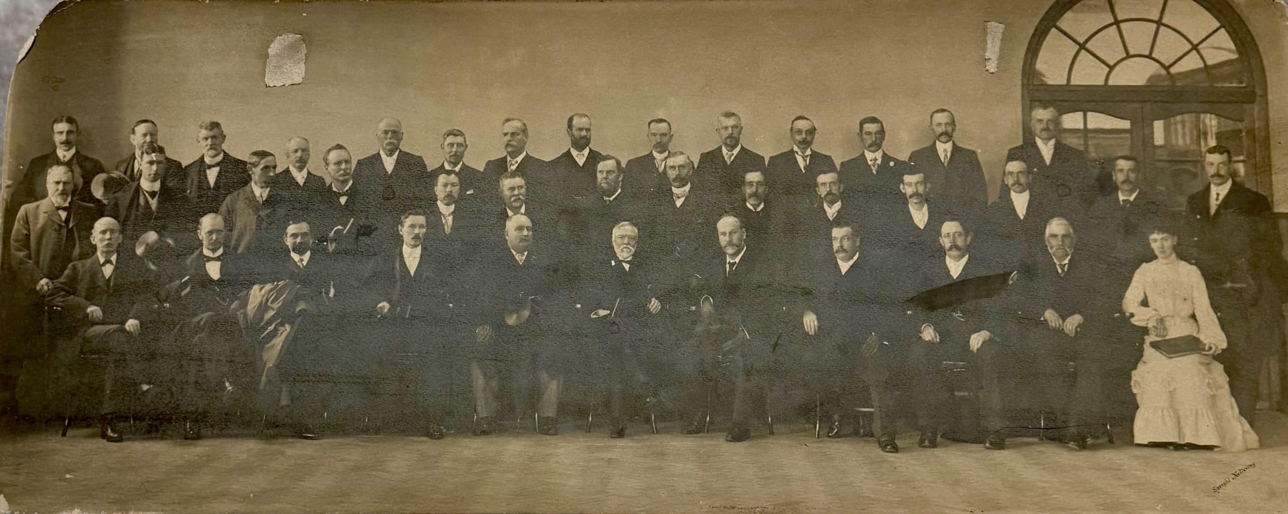 38 men and one woman – a group photo inside the Library on opening day, with Pierce seated on the right. (“Souvenir of Opening of Kettering Public Library”, 1904)