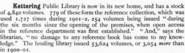 A library in Kettering would need somewhere to call home. “After various buildings had been inspected,” Pierce later wrote, “the Town Hall [today’s Kino Lounge on Market Place]… was finally taken at a rental of £50 per annum”. Initially stocked with 1,660 books, it also contained a “newsroom” which Pierce proudly stated had “15 daily and 21 weekly newspapers, and 17 monthly magazines”, all available to the people of Kettering to read for free.