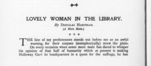 “Recently I visited a library where the trail of the feminine is in evidence, and was particularly struck by the demure appearance of one member of the staff.” Hartham described a woman working there as “the statuesque but captivating creature behind the counter” who was joined by “another, equally entrancing but rather less statuesque” colleague.