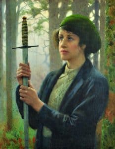 In The Vow, a young woman is seen holding a sword by its blade. With the handle forming a cross, she is striking a pose similar to that of a medieval knight taking an oath. The symbolism of this painting is a source of much debate, but one theory points towards the Suffragette movement. With the distinctive beret and her determined expression, is the subject vowing to fight for equality for women? It is said that Caroline Gotch was a supporter of the Suffragettes.