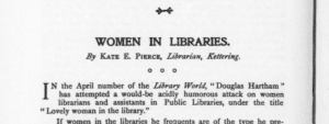 In the March 1901 issue of Library World, an article by Frank E. Chennell from Willesden Green Library was published. Titled Lady Assistants in Public Libraries, it questioned whether libraries should continue to employ women, warning that the “heavy incursion of the lady assistant into the ranks of our profession should be considered with some gravity”.